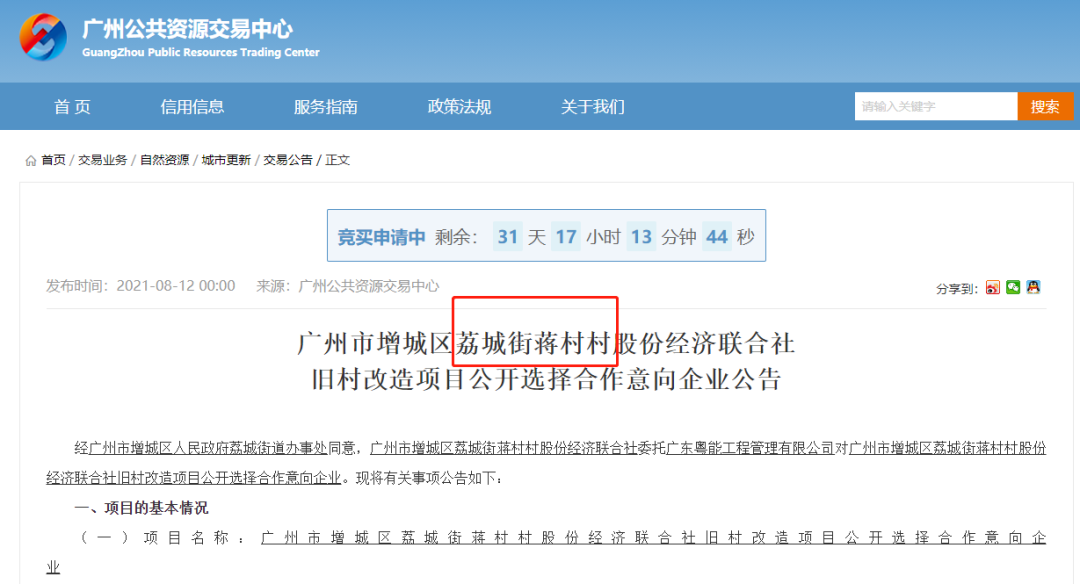 今天,广州公共资源交易中心发布增城荔城街蒋村村股份经济联合社旧村改造项目公开选择合作意向企业公告。