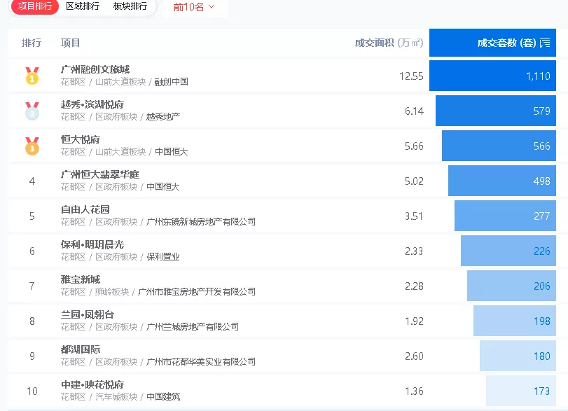 在区域成交前十的楼盘中,山前大道板块也贡献了三位选手,分别是广州融创文旅城、恒大悦府及合景保利·香樾四季花园,成交均价在2-2.3万/㎡。