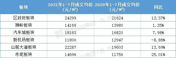 目前,截至7月底,板块成交均价为22287元/㎡,是区域内唯二均价破2万的板块,仅次于区府板块。此外克而瑞监测到,该板块成交均价同比去年增长13.7%,仅次于赤坭板块。(克而瑞数据显示,近三年赤坭板块内仅祈福水岸花园一个项目在售,该板块房价涨幅参考性较低)