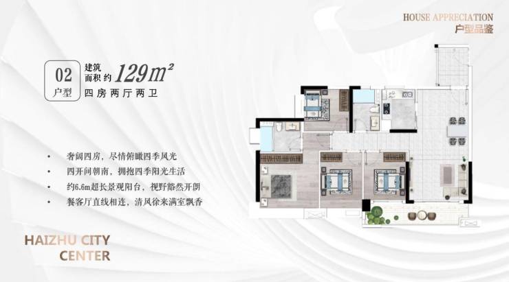 预算充足的买家,还可以选择建面约129㎡户型,四房带套间,并同时集合了以上户型的入户花园、大阳台(约6.6米)等亮点,直接一步到位。