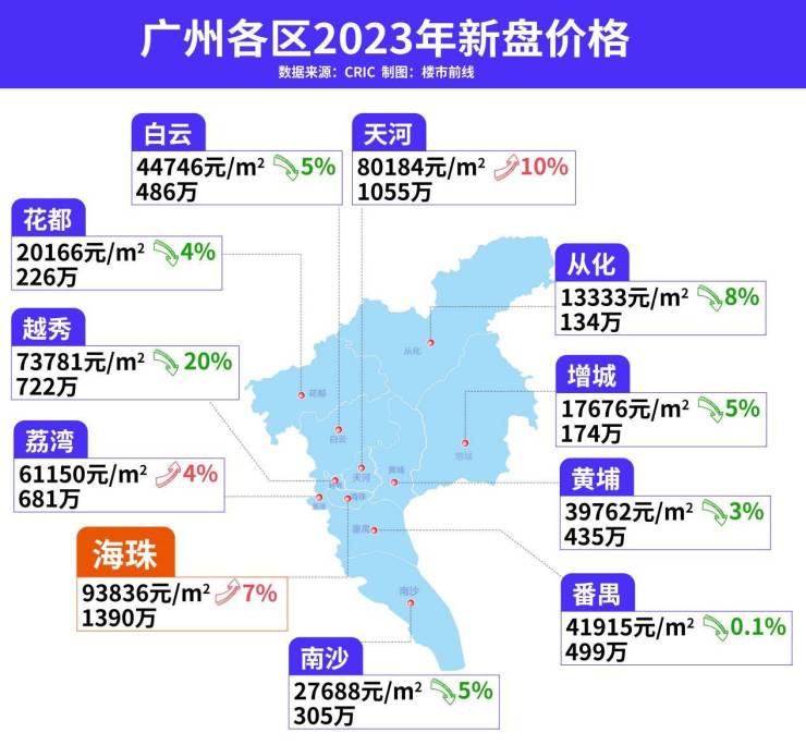 数据显示,去年海珠区的新房均价约93836元/㎡,套均总价1390万元,双双登顶广州榜首。