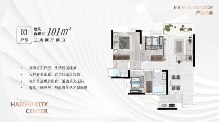 如果追求居住的空间感,也可以考虑建面约111㎡的大三房,实现更阔绰的居住体验。约6.5米的奢阔大阳台,更是带来极致的景观视野,美景一览无遗。
