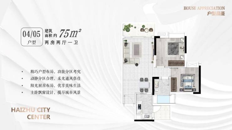 就比如建面约75㎡的大两房,经典竖厅设计,LDK一体,动静分离,还是双阳台设计,两个卧室都做了大飘窗,既增加了室内的采光,又扩宽了生活空间。