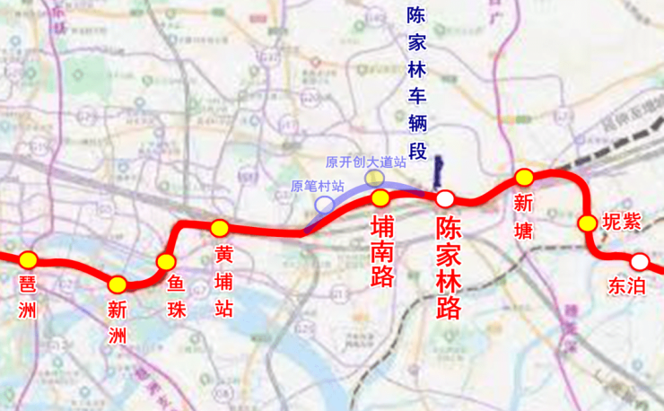 砍掉黄埔云埔段最初设计的两站(笔村+开创大道/东鹏大道)、笔村车辆段,调整为埔南路站,并增设新塘陈家林路站及陈家林车辆段。
