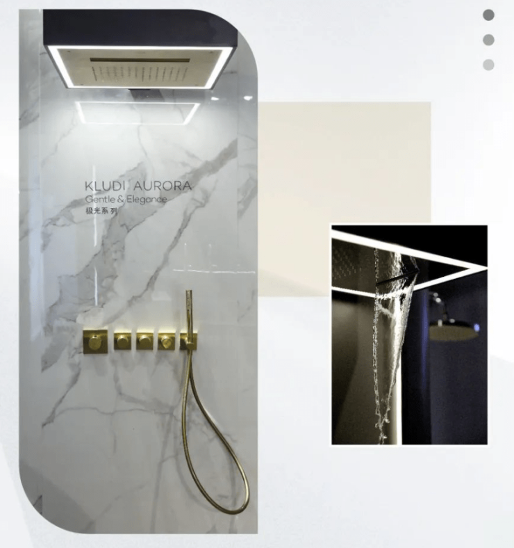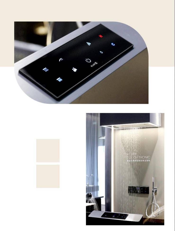 本次展览中,参观者可一睹KLUDI基于easy life理念设计的KLUDI TOUCH TRONIC超薄淋浴面板。科技感十足的电子显示面板,嵌入智能程序,兼容多项功能,触碰即可开关水流、调节温度、切换模式,多种用水方式一目了然。该面板还配备了远程数字智控功能,连接APP进行相应设置,可自定义用水模式,预设用水习惯、记忆3种个性化淋浴程序,用科技赋能新一代高端品质生活方式。这是顺应数字消费潮流,用触控科技升级沐浴体验的最新尝试。