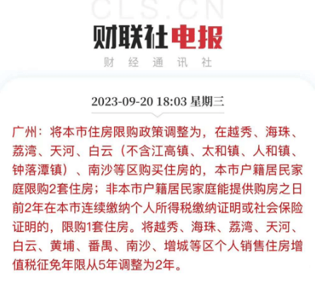 9月20日,广州市人民政府办公厅发布了《关于优化我市房地产市场平稳健康发展政策的通知》将住房限购政策调整为,在越秀、海珠、荔湾、天河、白云(不含江高镇、太和镇、人和镇、钟落潭镇)、南沙等区购买住房的,本市户籍居民家庭限购2套住房;非本市户籍居民家庭能提供购房之日前2年在本市连续缴纳个人所得税缴纳证明或社会保险证明的,限购1套住房。非户籍人口首套房购置纳税社保年限从5年收缩至2年。
