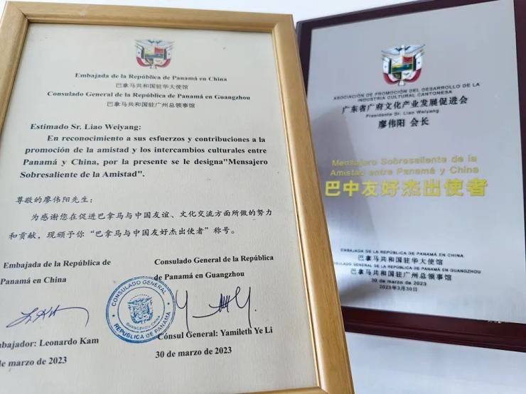 在采访现场,笔者看到了众多关于广府会的荣誉报道及活动精彩剪影。多年来,凭借出色的表现,廖伟阳获得了多项殊荣,如今年3月,巴拿马共和国驻华特命全权大使Leonardo Kam(甘林)阁下向廖伟阳颁发了“巴中友好杰出使者”证书及牌匾。
