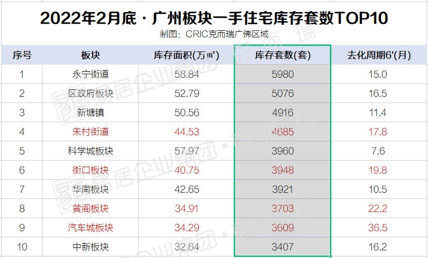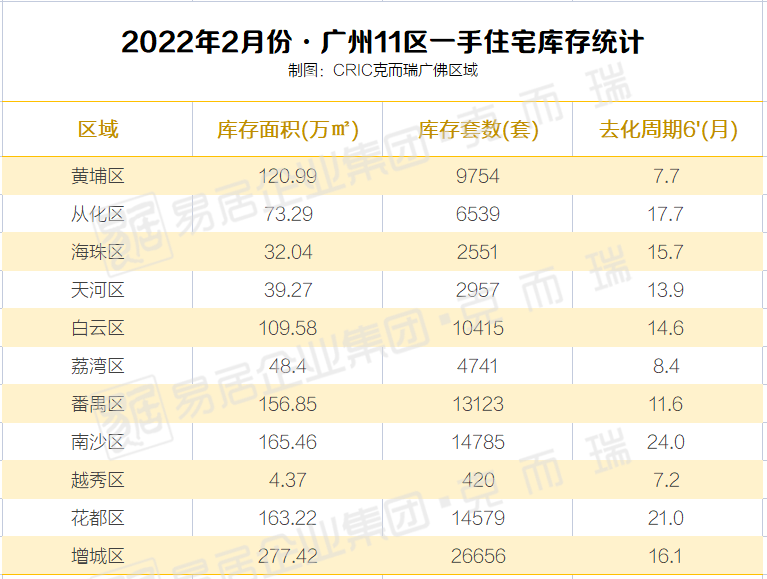 黄埔、白云、番禺、南沙、花都以及增城六区一手住宅库存面积超百万方,以增城区积压最多,高达277.42万方。