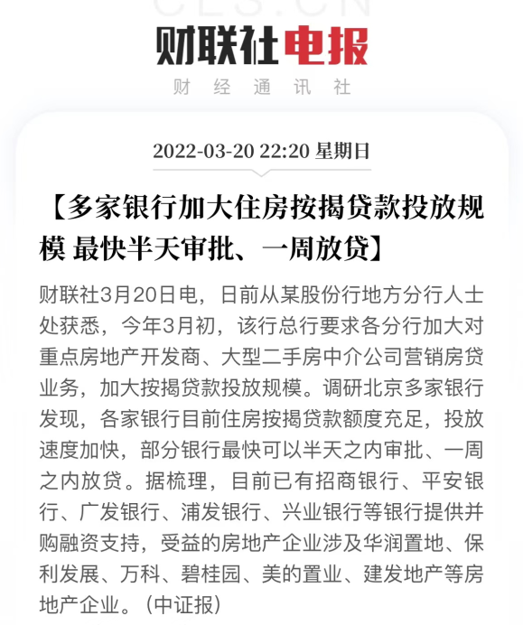 此外,据媒体爆料,在3月初,多家银行加大住房按揭贷款投放规模,较快半天审批、一周放贷的。