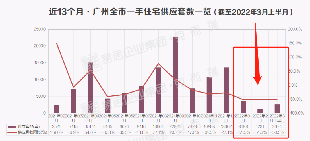 除此之外,从供应量看,1月份的三千多套供应到2月仅有千余套入市、以及传统小阳春的3月上半月也仅2674套供应,相比同期(2021年3月上半月)减少了50.3%,在广州住宅供应量暂缓、几经休市的背景下,全市库存依旧多次高企,验证了一手市场去化不理想的现状。