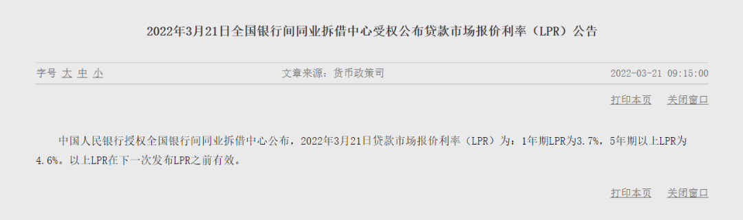 中国人民银行授权全国银行间同业拆借中心公布,2022年3月21日贷款市场报价利率(LPR)为:1年期LPR为3.7%,5年期以上LPR为4.6%。以上LPR在下一次发布LPR之前有效。