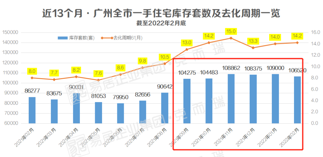 按照近6个月市场库存消化的速度计算,广州现有的住宅库存需要消化14.2个月的时间,去化周期排近一年次新高,这也意味着楼市库存远高于正常去化水平。