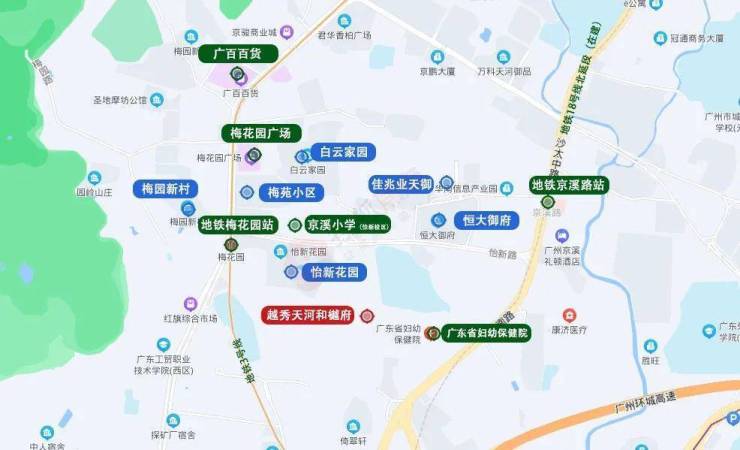 梅花园广场、大塘商业中心、信达金茂广场、一五七医院、南方医科大学南方医院、白云区京溪小学(怡新校区)等分布于此。