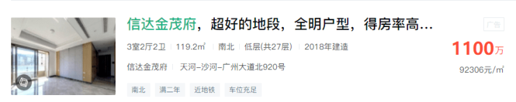 价格方面,我们参考附近的次新小区金茂府,其二手房均价约92967元/㎡。一套建面约110㎡三房二手房房源,总价约1100万元。