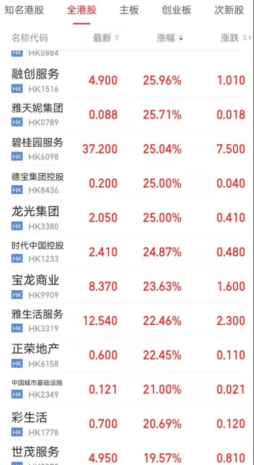港股地产股方面,截至11时,融创中国领涨超38%,旭辉控股涨超25%,龙光集团涨超25%,时代中国涨超24%,正荣地产涨超20%, 世茂集团涨超19%,碧桂园涨超18%,恒大涨超13%。物业股碧桂园服务涨超25%,雅生活服务涨超22%。