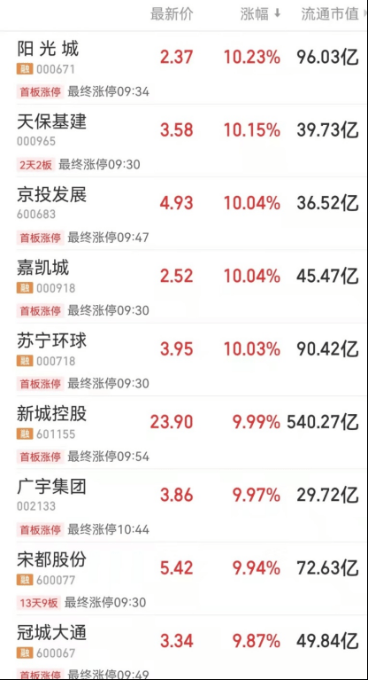 3月17日,受利好消息提振,地产股全线飙升。截至上午11时,A股阳光城、天保基建、京投发展、嘉凯城、新城控股、广宇集团、新华联等涨停。中交、万科、中南、珠江股份等涨幅居前。