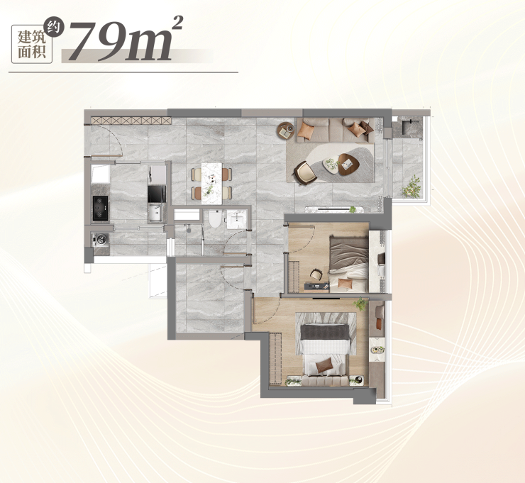 建面约79㎡三房户型,可以说是广州主城内极为罕见的望江户型。