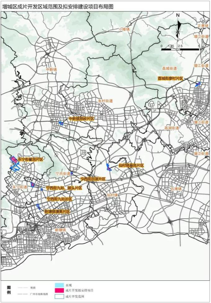新塘镇塘美片区、宁西街百湖片区、宁西街九如片区、宁西街九如和陂头片区、永宁街翟洞片区、中新镇慈岭片区、仙村镇基岗片区、荔城街廖村片区