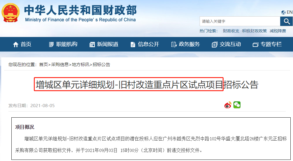 近日,中华人民共和国财政部发布增城区单元详细规划-旧村改造重点片区试点项目招标公告。