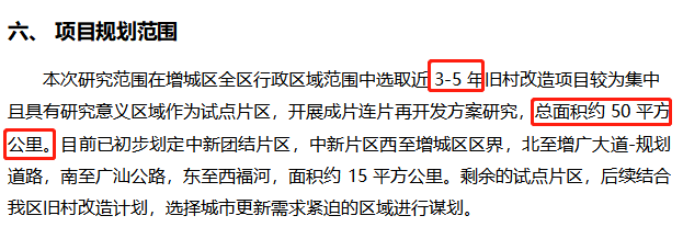 公告截图据了解,项目将选取近3-5 年,旧村改造项目较为集中且具有研究意义区域作为试点片区,开展成片连片再开发方案研究,总面积约 50 平方公里。