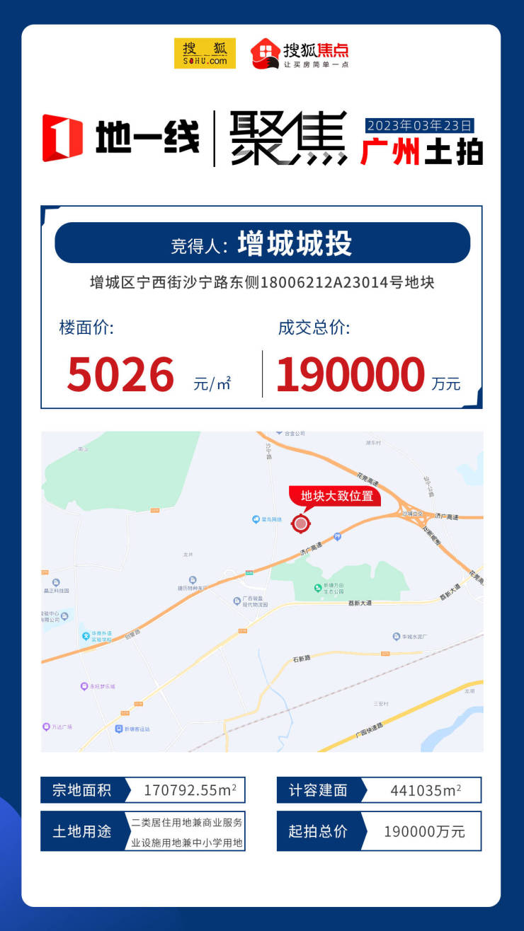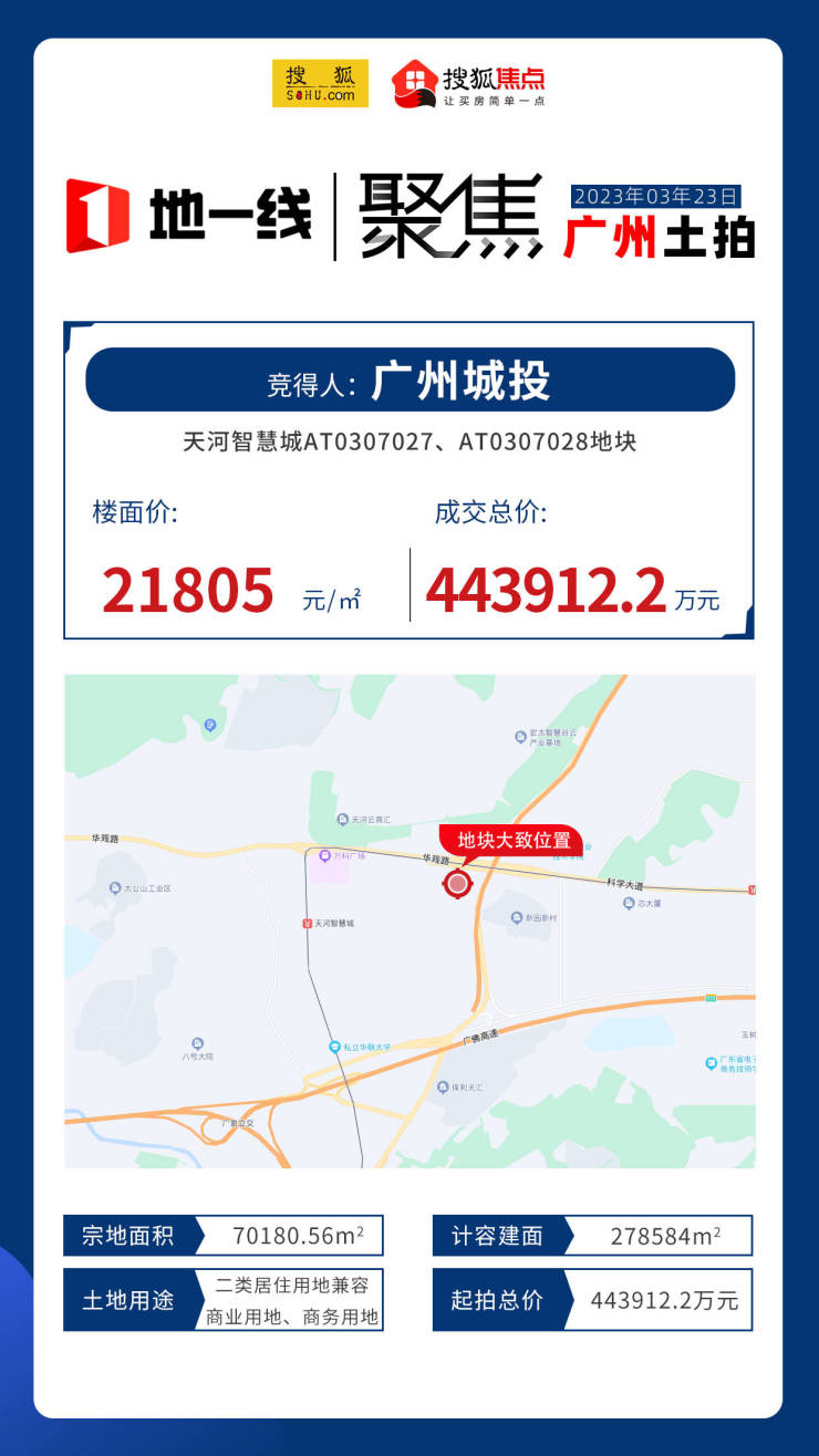 最后,来看看于今日(3月23日)率先出让的两宗涉宅地:天河智慧城AT0307027、AT0307028地块/增城区宁西街沙宁路东侧18006212A23014号地块。两宗地块,分别由广州城投、增城城投底价竞得,成交总价超63亿元。