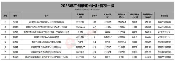 随后在2月21日,广州2023年首批商品住宅用地陆续挂牌出让。清单(第一批)中的21宗涉宅地,仅有8宗正式登台亮相。