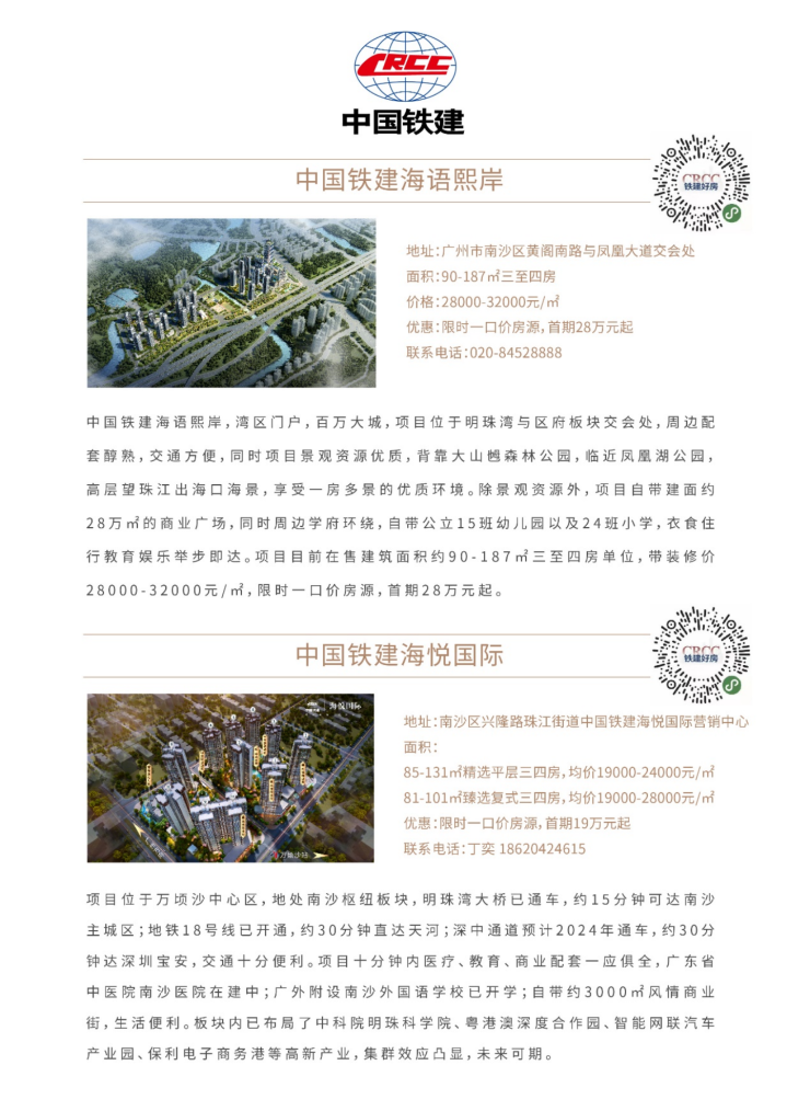 中国铁建南沙投资发展有限公司营销总监许灵峰介绍说,2015年,作为排名前列批进驻南沙的中央企业,中国铁建落子南沙,成立南沙投资公司。近年来,中国铁建投资近千亿,重点围绕城市综合开发、基础设施建设、房地产开发三大业务板块,以深耕南沙、辐射大湾区为定位,先后打造环球中心、水岸广场、海语熙岸、海悦国际、万顷沙保税港加工制造业区块综合开发项目、庆盛枢纽区块项目、横沥项目、花都项目等房地产项目,并参与明珠湾大桥、广州市第二中学附属南沙学校、广州127工程南沙科研基地、广州地铁18、22号线等重点工程项目,为南沙发展贡献铁建力量、铁建智慧和铁建方案。未来,中国铁建将以做国内一流城市综合运营服务商为目标,持续发挥央企担当,坚持城市深耕,为南沙“三区一中心”建设作出更大的贡献,助力南沙发展。