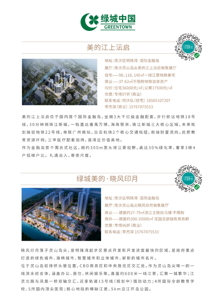 下午,巡盘品鉴团来到第二站——绿城美的·晓风印月&江上沄启。晓风印月作为绿城在南沙开发的超大综合体,以绿轴生态办公、滨江独栋办公塑造办公新生态,以商业街打造灵山岛尖城市商业生活街区,为塔尖阶层带来一站式绿城生活体验。美的·江上沄启作为美的与绿城的合作项目,目前在售户型建面约98-118㎡,是岛尖年度望江封藏之作,集纳区位、配套、景观于一体。岛上最后的东北向瞰江视野,极大程度上满足人们对江景的渴望,赋予居者不同的生活体验。
