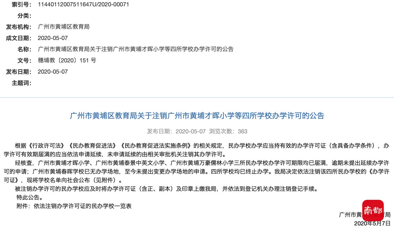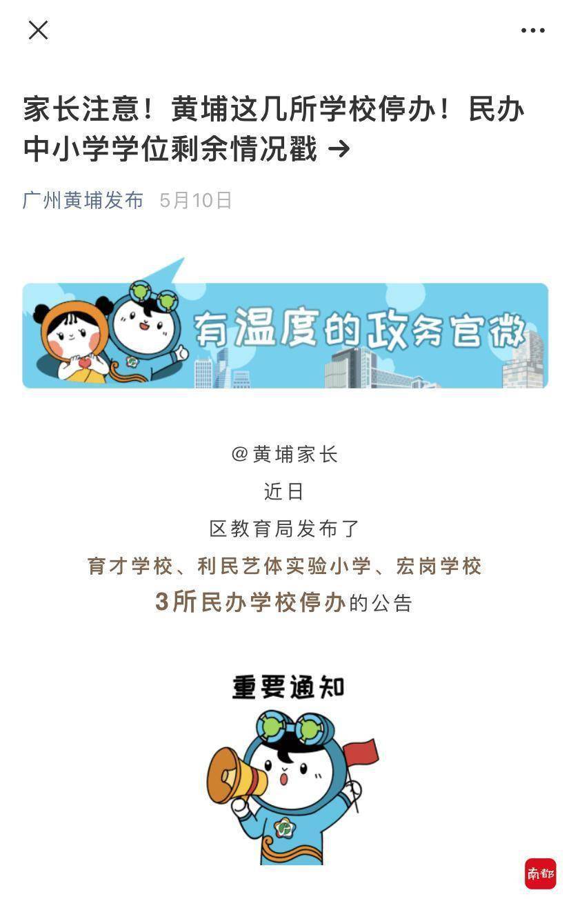 今年5月,公众号“广州黄埔发布”发送推文称,区教育局发布了育才学校、利民艺体实验小学、宏岗学校3所民办学校停办的公告。