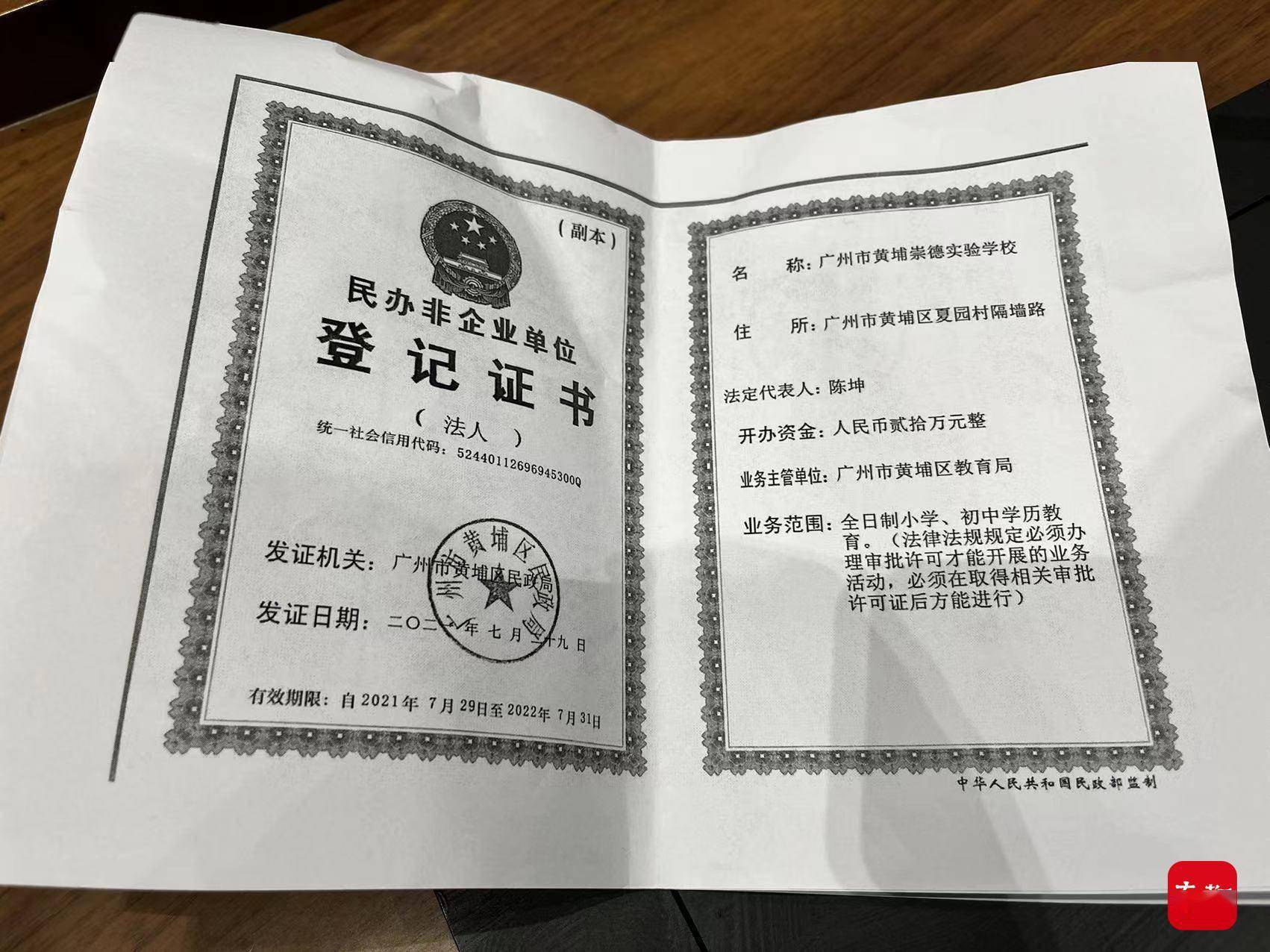 黄埔崇德实验学校的办学许可证,只续期到2022年7月31日