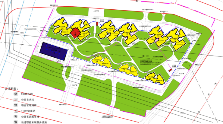 根据规划图可知,项目总用地面积约69123㎡,可建设用地约37364平方米,总建筑面积约192104.5平方米,总楼栋数为6栋高层住宅、3栋小高层住宅、1栋公寓及附属配套商业,还需配建1所9班幼儿园、1座公交站场。