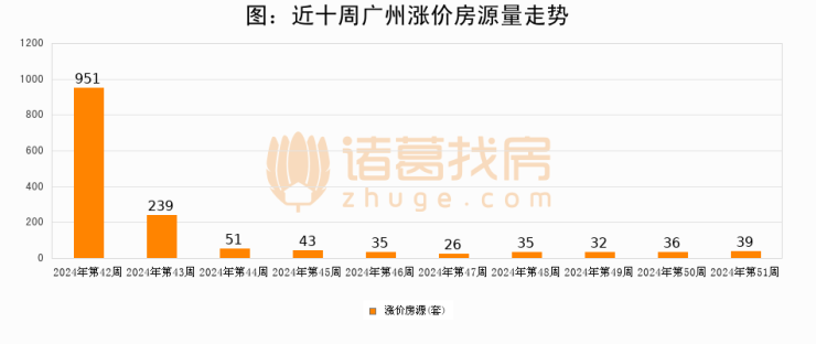 从调价房源来看,第51周广州涨价房源39套,较上周上涨8.3%。与此同时,51周涨价房源占比提升2.83个百分点,业主信心持续恢复。