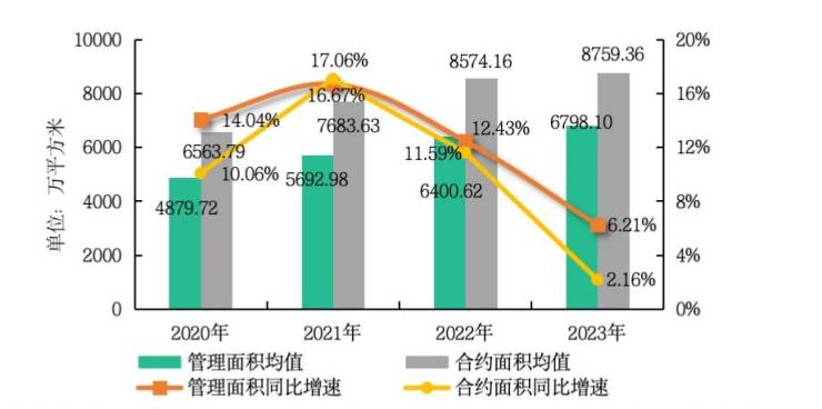 报告数据显示,2023年,百强企业管理面积均值为6798.10万平方米,同比增长6.21%,增速较2022年下降6.22个百分点,近5年来首次低于10%;合约面积均值为8759.36万平方米,同比增长2.16%,增速较2022年下降9.43个百分点。