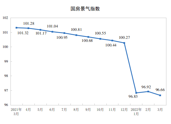 3月份,房地产开发景气指数(简称“国房景气指数”)为96.66。