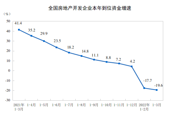 1—3月份,房地产开发企业到位资金38159亿元,同比下降19.6%。其中,国内贷款5525亿元,下降23.5%;利用外资10亿元,下降7.8%;自筹资金12395亿元,下降4.8%;定金及预收款12252亿元,下降31.0%;个人按揭贷款6369亿元,下降18.8%。