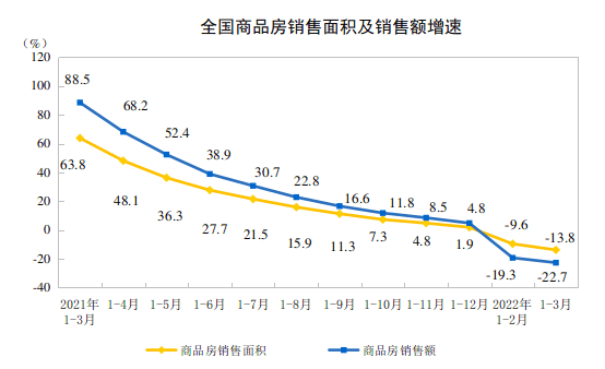 1—3月份,商品房销售面积31046万平方米,同比下降13.8%;其中,住宅销售面积下降18.6%。商品房销售额29655亿元,下降22.7%;其中,住宅销售额下降25.6%。3月末,商品房待售面积56113万平方米,同比增长8.2%。其中,住宅待售面积增长14.2%。