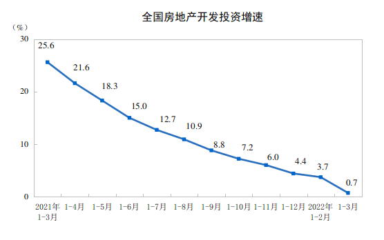 4月18日,国家统计局发布数据显示,2022年1—3月份,全国房地产开发投资27765亿元,同比增长0.7%;其中,住宅投资20761亿元,增长0.7%。