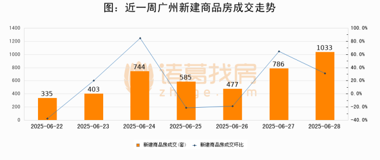 根据广州市住房和城乡建设局数据显示,2025年06月28日广州新建商品房成交1033套,较昨日增加247套,环比上涨31.4%