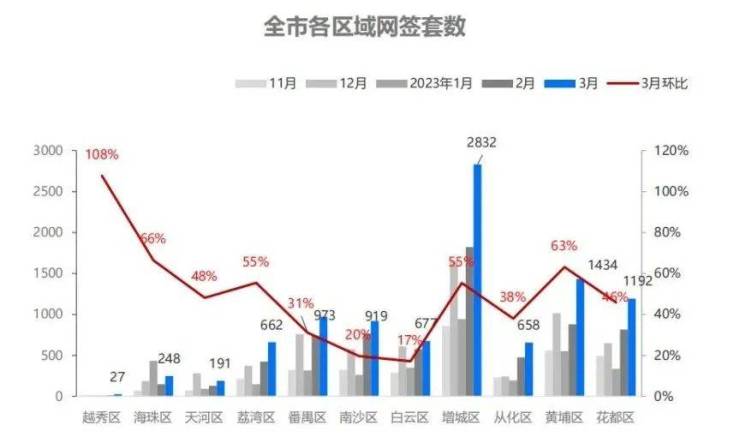 回归广州楼市,据贝壳研究院数据显示(4月数据暂未出来),自开年以来,全市一手住宅网签量各区均有所上升,新房和二手房的成交均价也在同比上涨。