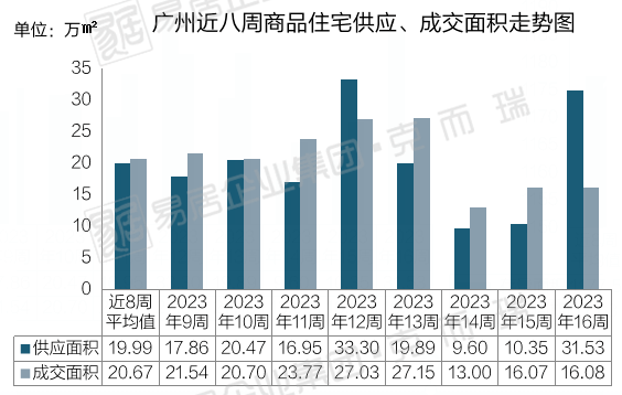 据克而瑞数据显示,第16周广州商品住宅供应3020套,供应面积31.53万㎡,环比上升204.64%,广州楼市供应量井喷。