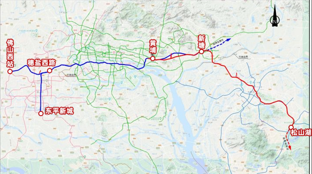 主干线为佛山东平新城到东莞松山湖,西边还有一条分支线路,佛山西站到穗盐西路。东边还预留了一条分支线路,新塘到惠州。