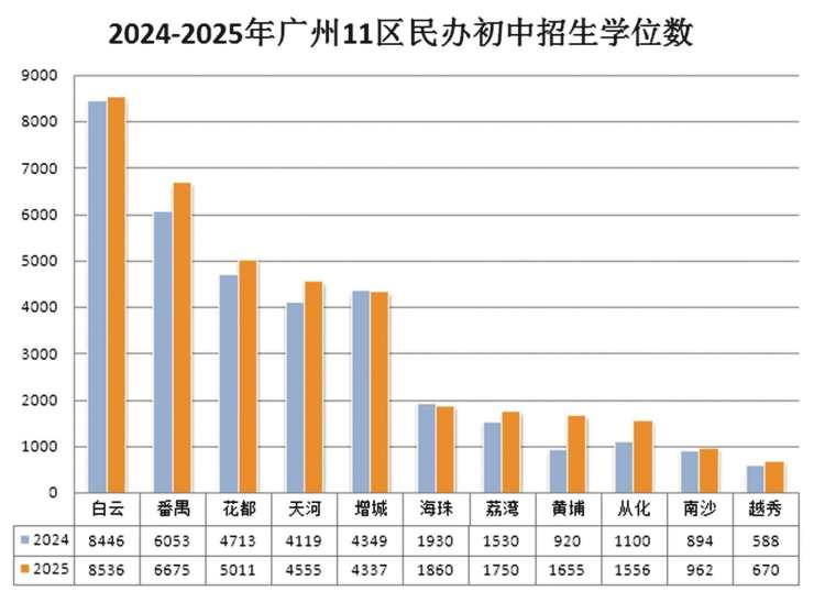 2025年,广州11区民办初中学位数量从高到低排列分别为:白云18所学校,提供8536个学位;番禺31所学校,提供6675个学位;花都19所学校,提供5011个学位;天河25所学校,提供4555个学位;增城25所学校,提供4337个学位;海珠7所学校,提供1860个学位;荔湾12所学校,提供1750个学位;黄埔9所学校,提供1655个学位;从化5所学校,提供1556个学位;南沙5所学校,提供962个学位;越秀4所学校,提供670个学位。