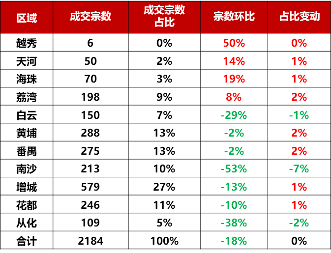 具体到各区,广州11区中仅4区成交上涨,分别为中心四区越秀、天河、海珠、荔湾;