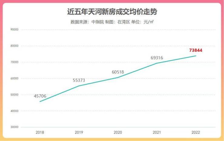 尤其近几年天河的新房供应一直供不应求,成交均价更是从2018年的4字头一路高歌至今年的73844元/㎡。