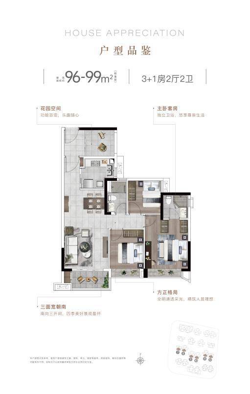 建面约96-99㎡3+1房带主套,居住空间阔绰度方面更上一层楼,实现了同等面积多一房的配置,三开间南向,全屋通风、采光俱佳。动静分离设计,主套空间阔绰,有独立的卫浴、步入式衣帽间,一家多口同住,也有各自私密空间。