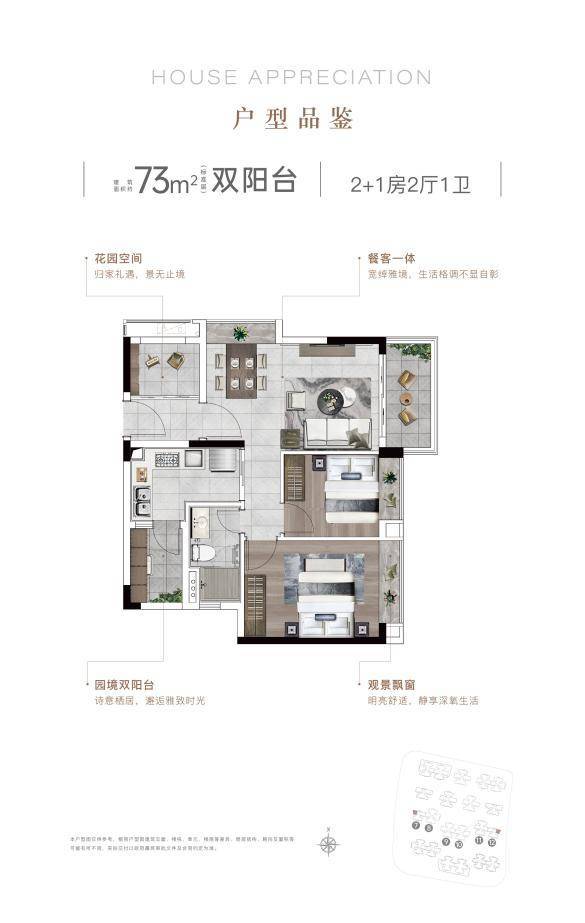 建面约73㎡2+1房的户型,提供了两种风格的户型可供选择。空间均衡,配备双阳台,是入手天河中心物业的优选户型,在控制总价的基础上,实现更好的居住品质。