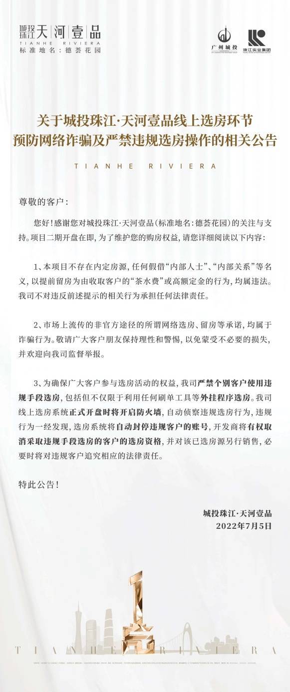 据现场探来口风,本次天河壹品二期加推,据说跟一期采用同样线上选房的形式,通过官方公示选房结果。