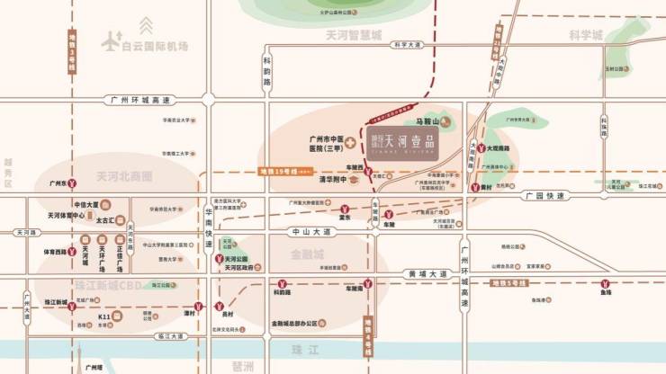 交通方面,通达性高。从项目出发,20分钟通勤圈可覆盖珠江新城、金融城和琶洲三大商务区;目前周边地铁21号线和4号线开通运营,通过地铁出行可以轻松畅达广州各区,此外,项目南侧还规划有19号线(车陂西站)。