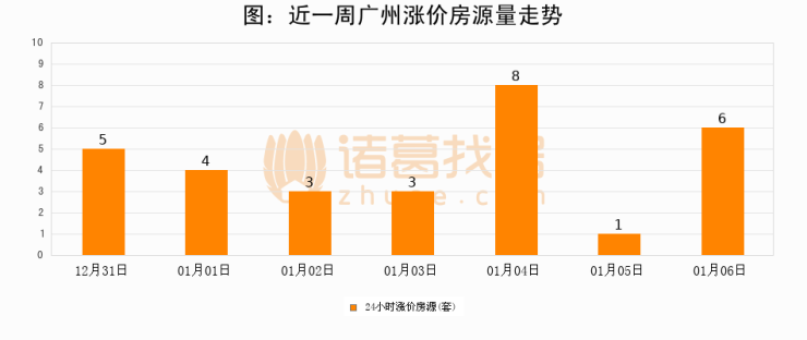 根据诸葛找房数据显示,广州24小时涨价房源量为6套,较01月05日增加5套,环比上涨500%。与此同时,涨价房源占比小幅扩大,业主信心有所提升。