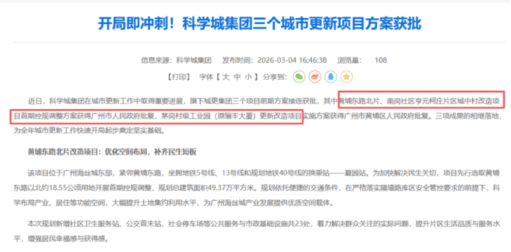 3月6日,科学城集团再传佳音,旗下三大城市更新项目方案接连获批。其中,黄埔东路北片、南岗社区亨元柯庄片区城中村改造项目首期控规调整方案获广州市人民政府批复,茅岗村级工业园(原骊丰大厦)更新改造项目实施方案获黄埔区人民政府批复。三大项目的获批为黄埔全年城市更新工作开局奠定坚实基础,尤其是黄埔东路北片项目,依托夏园站多维交通优势,规划新增 23 处公共服务与市政基础设施,既优化了空间布局,又补齐了民生短板,为广州海丝城产业发展提供了优质空间载体。